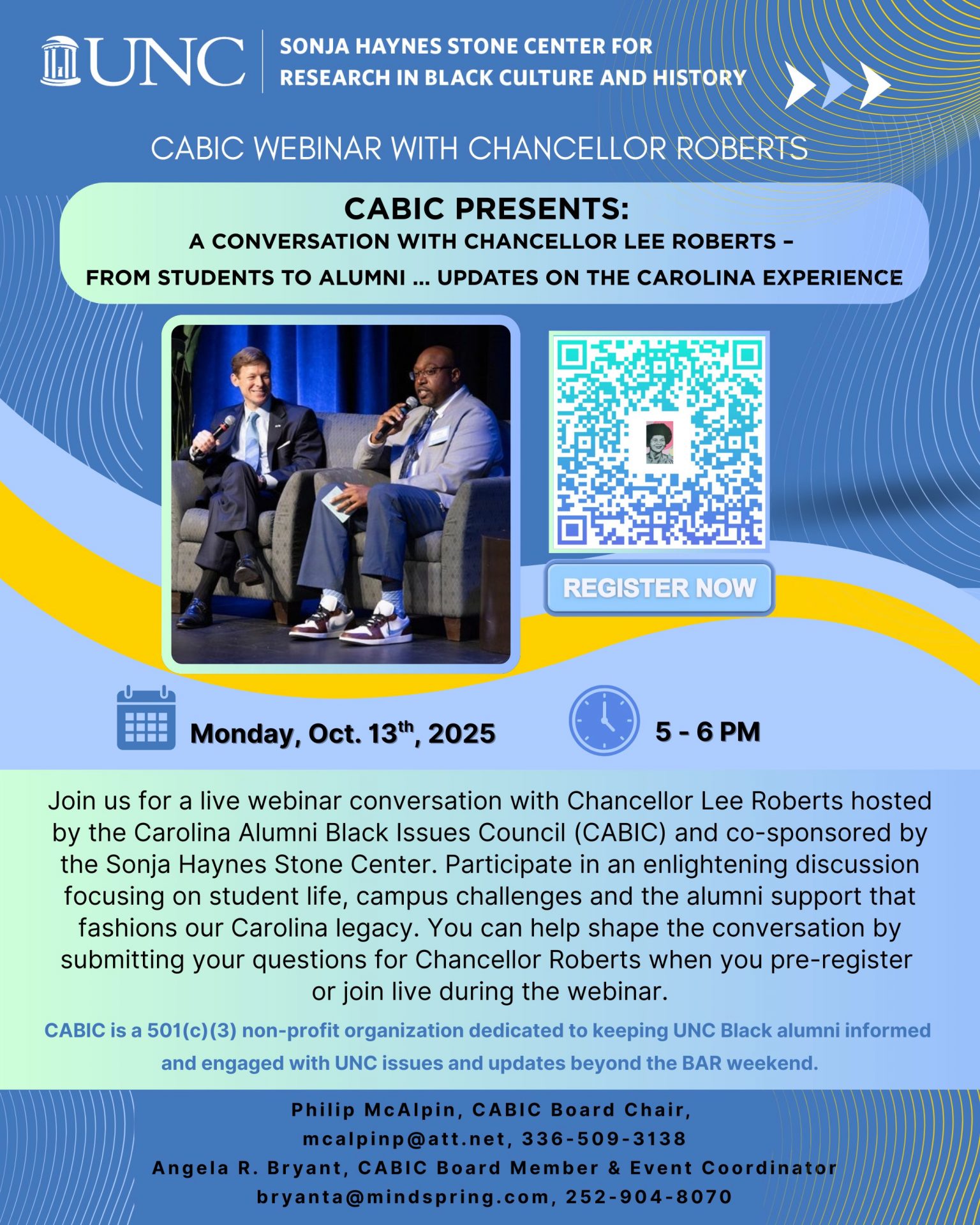 Don’t miss this live webinar with Chancellor Lee Roberts, hosted by the Carolina Alumni Black Issues Council (CABIC) and co-sponsored by the Sonja Haynes Stone Center. Engage in an enlightening discussion on student life, campus challenges, and the vital role of alumni in shaping Carolina’s legacy. Submit your questions when you pre-register, or ask them live during the webinar!